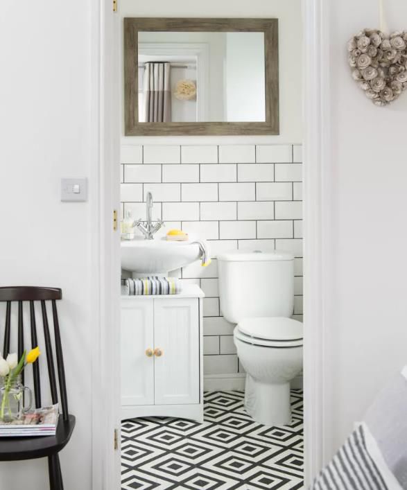 尋找智能解決方案以節省非常有限的衣帽間的空間。利用角落水槽騰出寶貴的空間來移動。如果您的門直接打開到水槽上,這個樓下的想法特別有效 - 設計越小,感覺限制越少。尋找一個角落存儲單元坐在水槽下方以節省更多空間。