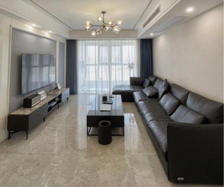 這是客廳,雖然還沒其他的軟裝裝飾,但是效果真心不錯。客廳布置了“L”型真皮沙發(fā),黑色給人一種成熟穩(wěn)重的感覺,不管是坐著還是躺著,都很舒服。安裝了吊頂,頂面貼了金屬線條,增加了視覺沖擊感,很是讓人喜歡,增加了時尚感。