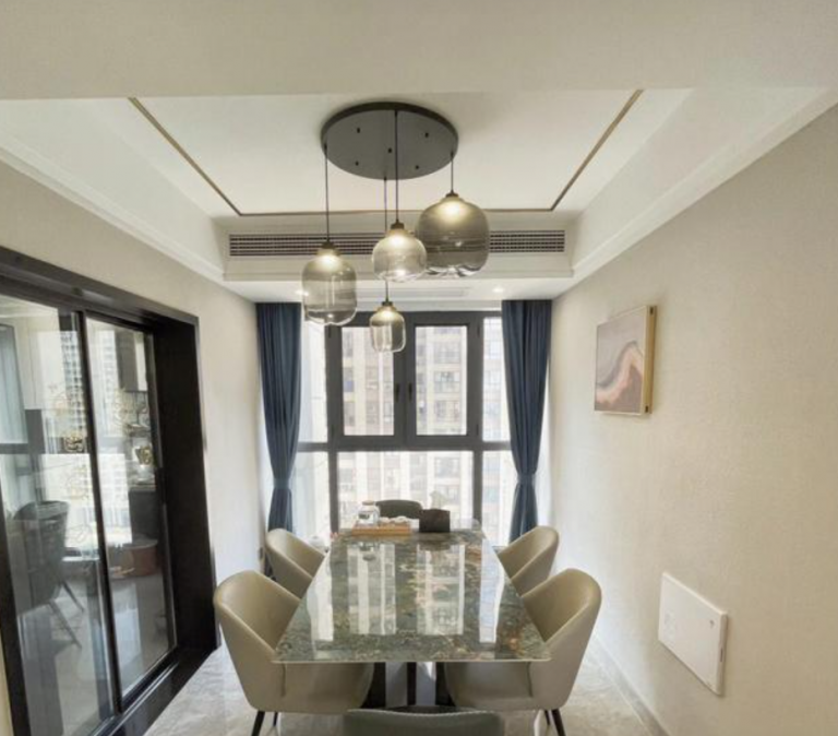 這是餐廳,布置了一張方形巖板餐桌,占用的空間大小位置合適,一家人開開心心坐在一起用餐,真的很幸福了。空間不大,但是看著這個角度,跟我們常見的樣板房一樣,顏值很高,也很時尚。餐廳大大的落地窗,采光非常充足,光線很好。而且旁邊就是廚房了,煮好的飯菜可以很快端出來,方便用餐!